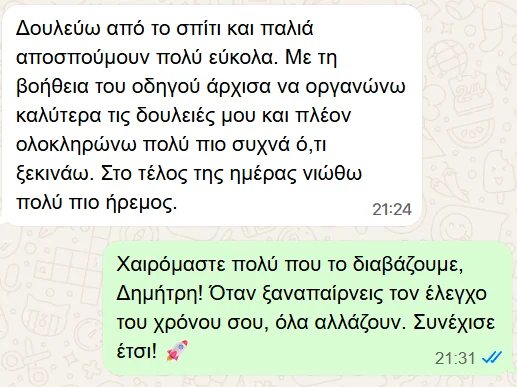 Δες τη διαφορά μέσα σε λίγες εβδομάδες: περισσότερα tasks ολοκληρωμένα, άδειες λίστες εκκρεμοτήτων και αίσθηση αληθινής επιτυχίας.